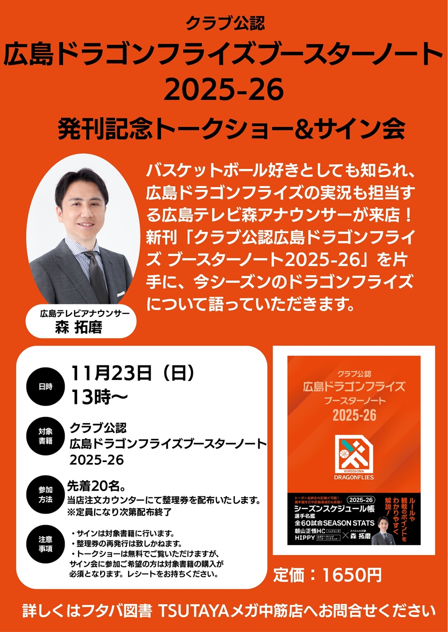 11月23日(日)に、広島テレビアナウンサー森琢磨さんによるトークショーを開催いたします。 ・トークショーの参加は、整理券が必要になります(無料) 只今、MEGA中筋店にて整理券を配布しております(先着20名) ・サイン会の参加は、対象の本のご購入が必要となります。 当日ご購入ください(事前にご購入の方は、MEGA中筋店で購入した際のレシートをお持ちください) バスケ好きのご来店、お待ちしております♪ 【開催日時】11月23日(日)13:00~(開場12:40) 【開催店舗】フタバ図書 TSUTAYA MEGA中筋店 【住 所】広島市安佐南区中筋4丁目11-7 【電 話】082-830-0600