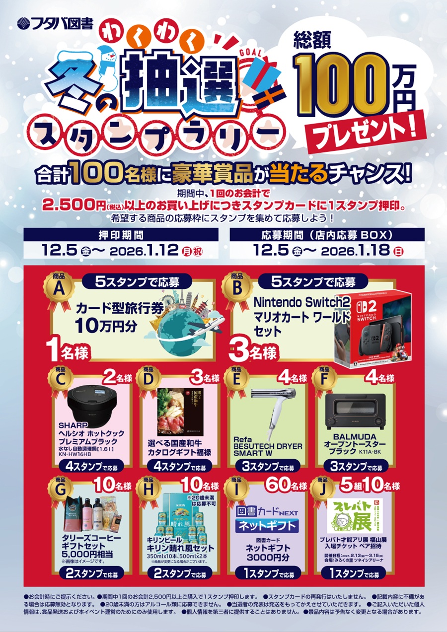 いつもフタバ図書をご利用頂き、ありがとうございます。 感謝を込めて、12/5(金)より、冬の抽選スタンプラリーを開催します。 期間中、1回のお会計で2,500円(税込)以上のお買い上げにつき スタンプカードに1スタンプ押印いたします。 ご希望の賞品を選んで、店舗にある応募BOXにご応募ください。 詳しくは、店頭スタッフまでお気軽にお声かけください。 ご来店お待ちしております。 押印期間:12/5(金)~2026/1/12(月・祝) 応募期間:12/5(金)~2026/1/18(日) 開催店舗 16店舗 フレスタモール岩国店/大竹店/防府店/アルパーク北棟店 TERA広島府中店/MEGA中筋店/祇園店/可部店/上安店 海田店/福山店/広店/横川店/五日市福屋店 三次店/福岡春日店