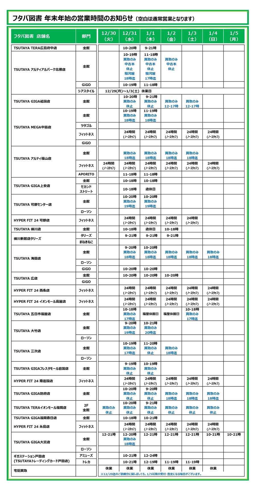 年末年始 フタバ図書各店の営業時間のお知らせ