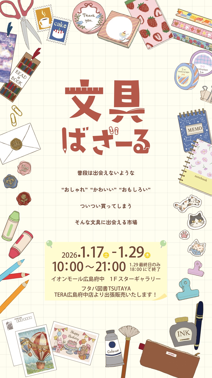 文具好きのみなさんへ、『文具ばざーる』開催のお知らせです! 普段は出会えないような ”おしゃれ” ”かわいい” ”おもしろい” ついつい買ってしまうそんな文具に出会える市場 かわいい文具たちに囲まれ、わくわくときめきましょう! ご来店お待ちしております。 ■開催情報 期 間:2026年1月17日(土)~1月29日(木) 時 間:10:00~21:00 ※最終日(1月29日)のみ18:00終了 場 所:イオンモール広島府中「1Fスターギャラリー」 問合せ:フタバ図書 TSUTAYA TERA広島府中店【TEL 082-561-0770 】 ■クリエイター・メーカー紹介 ----------------------------------------------- Krimgen ( @krimgen_illustrations ) Krimgen(クリムゲン)はオリジナルイラストを元に文房具などの 様々な雑貨をデザインしたり、画集や絵本などを製作しています。 自然や子供達を生き生きと描き、こんな世界に住んでみたいと 思える穏やかな温かい世界を創り出すことを目指しています。 ----------------------------------------------- ア・ラ・カル堂( @alacarudou ) ほっこりおいしそうなイラストと、わくおくするような遊びごころのある ステーショナリーを制作しています。 ア・ラ・カルトメニューのようにお好きなメニューをぜひお選びくださいませ。 ----------------------------------------------- 訓子 ( @kunkophoto ) 自分で撮影した写真を色彩加工して、透明しおりや透明葉書など様々な写真雑貨にしています。 普段よく目にする風景の色彩を変化させることで、 ご覧頂いた方の日常も特別なものだと感じて頂けたら有難いです。 ----------------------------------------------- COMO ( @comodo_sapporo ) 北海道・札幌発! 「手にとった人の気持ちをワクワクさせるモノづくり」をテーマに制作する雑貨ブランドです ----------------------------------------------- Green Flash( @greenflash_official ) 「ときめき」「Witさ」をコンセプトに掲げ、 オリジナルのステーショナリーを製作している「GreenFlash」。 乙女心をくすぐるガーリーなブランドや、 思わずクスッとしてしまうシュールなブランドなど、 それぞれのデザイナーの持ち味を活かし、バラエティに富んだ作品が並びます。 日々の生活に取り入れるだけで、ちょっと幸せな気持ちになれる。 そんなステーショナリーの魅力を思う存分、ご堪能ください。 ----------------------------------------------- SAAYA MASAKI ( @saayamasaki ) SAAYA MASAKI 武蔵野美術大学大学院版画コース修了 美術大学在学中よりイラストレーターとしての活動を始め、 大学院修了後フリーランスのイラストレーターとなる。 柔らかさや優しさを感じられる線やかたちを大切に作品を制作している。 東京と出身地の香川県の2拠点で活動中。2024年6月には武蔵野美術大学「gFAL」にて個展を開催。 ----------------------------------------------- SAIEN ( @kmis_saien ) SAIENは1926年の創業から紙に向き合ってきたカミイソ産商がお届けする和紙雑貨ブランドです。 マスキングテープやシール、紙製品など優しい和紙の風合いがマッチした商品を多数取り揃えております。 ぜひお気に入りを見つけにブースへお立ち寄りください! ----------------------------------------------- シイング ( @shi_ing_mino ) シイングは1868年、岐阜県の和紙の産地、美濃市で創業しました。 「紙を考え、紙を楽しむ=紙イング」をモットーとして、 紙が持つ無限の可能性をあれこれと模索しながら、時に楽しく時にやさしく、 日々の生活に彩りを添えてくれるアイテムをたまには斬新な発想で企画、開発しています。 ----------------------------------------------- しばた商店 ( @keikoshibataillust ) 絵本『パンどろぼう』で大人気のイラストレーター兼絵本作家である 柴田ケイコさんの営む【しばた商店】からは、 個展「TABIA」で描き下ろしたイラスト30点のポストカードや 「風」をイメージしたイラストのメモ帳など ユニークで愛嬌たっぷりのキャラクターが日々のステーショナリーを彩ること間違いなし! 新作グッズ「TOMOROCK」の販売もあり“猫”や“ROCK”が好きな方はぜひお立ち寄りください! ----------------------------------------------- stamp knot – スタンプノット ( @stampknot ) 『はんこ』を通して人と人、想いを『結ぶ』 “私たちが使いたいスタンプを作る“をコンセプトにしているスタンプブランドです。 個性豊かなクリエイターデザインをどんどん世に出します。 ----------------------------------------------- 星燈社 ( @seitousha ) 星燈社は、2009年にスタートした「今に馴染む、日本の暮らし」を提案するプランドです。 星あかりのようにさりげなく日々に寄り添う暮らしの脇役でありたいと考えています。 ----------------------------------------------- てるふく商店 ( @terufuku_osoroi ) こんにちは、てるふく商店です。てるふく商店は、新潟で暮らす夫婦の小さなウェブショップです。 イラストレーターの妻が描いたイラストで、紙ものをはじめとしたイラスト雑貨を作って販売しております。 ぜひ手にとっていただけたら嬉しいです。 ----------------------------------------------- Pavilio/HARU LABO ( @pavilio_lt ) Pavilio(パビリオ)は1974年に新潟県三条市にて創業した 印刷会
