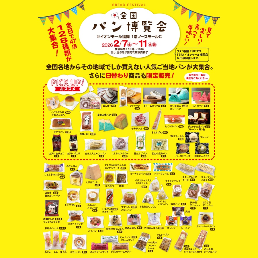 イオンモール福岡店にて、2/7(土)~2/11(水・祝)の5日間で 「全国パン博覧会」を開催いたします。 (会場は、イオンモール福岡「1FノールモールC」です) ■全国各地から厳選した、合計128種類のパンが勢ぞろい ・人気のご当地パン「トミーズのあん食」(兵庫県) ・長野県のソウルフード「牛乳パン」(長野県) ・見た目と味のギャップに驚く「スイカパン」(宮城県) ・クリームをたっぷり使用した定番人気の商品「クリームボックス」(福島県) などなど、各地域で愛されるパンやお取り寄せの人気パンが大集合! ■入場整理券の配布について 会場への入場は、整理券記載の時間でお願いいたします。 各日、9:00から整理券の配布を行いますので、ご希望の方は 「E2 ノースモール ルクルパーク前入口」にお並びください。 9:45で一度配布は終了させいただき、 10:00以降より、会場の「1FノースモールC」にて配布いたします。 ※当日は大変混雑することが予想されますので、整理券配布の件、ご理解ください。 (整理券は当日分のみ配布いたします。時間の指定はできません) ※商品の在庫には限りがありますので、売り切れの場合は、ご了承ください。 ↓ 9時からの配布場所はこちら ↓