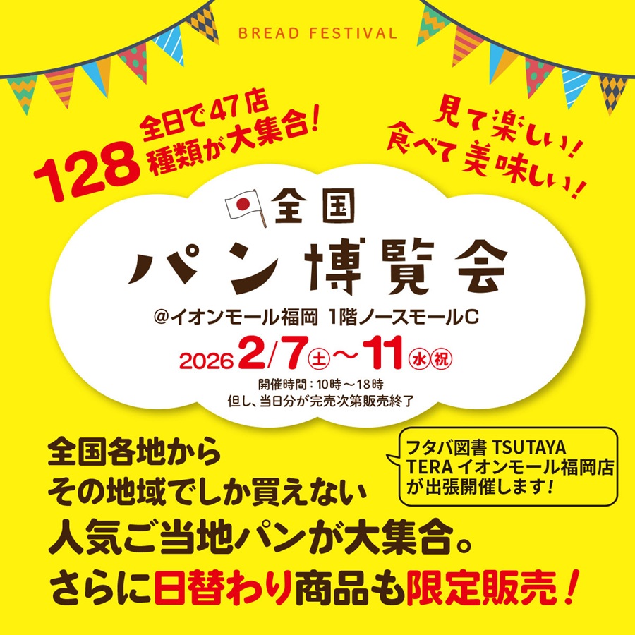 手に取って全国のご当地パンが購入できるチャンス。ぜひご来店お待ちしております。 日 程:2月7日(土)~2月11日(水・祝) 時 間:10:00~18:00 ※但し、当日分が完売次第販売終了 場 所:イオンモール福岡1FノールモールC 問合せ:フタバ図書 TSUTAYA TERAイオンモール福岡店【TEL 092-939-7200】