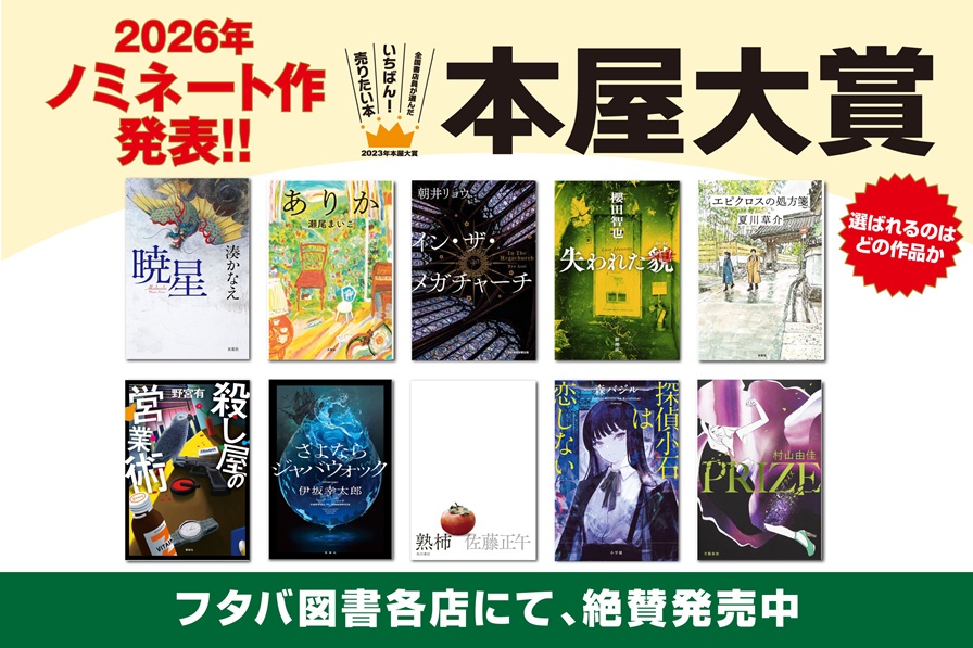 2026年 本屋大賞ノミネート10作品が発表されました。大賞発表は4/9です。 ■2026年本屋大賞ノミネート【作品名五十音順】 「暁星」湊かなえ/双葉社 「ありか」瀬尾まいこ/水鈴社 「イン・ザ・メガチャーチ」朝井リョウ/日経BP 日本経済新聞出版 「失われた貌」櫻田智也/新潮社 「エピクロスの処方箋」夏川草介/水鈴社 「殺し屋の営業術」野宮有/講談社 「さよならジャバウォック」伊坂幸太郎/双葉社 「熟柿」佐藤正午/KADOKAWA 「探偵小石は恋しない」森バジル/小学館 「PRIZE―プライズ―」村山由佳/文藝春秋 が選ばれました。ノミネートおめでとうございます。 フタバ図書でも絶賛発売中。書店員お薦めの1冊、ぜひお手に取ってみてください。