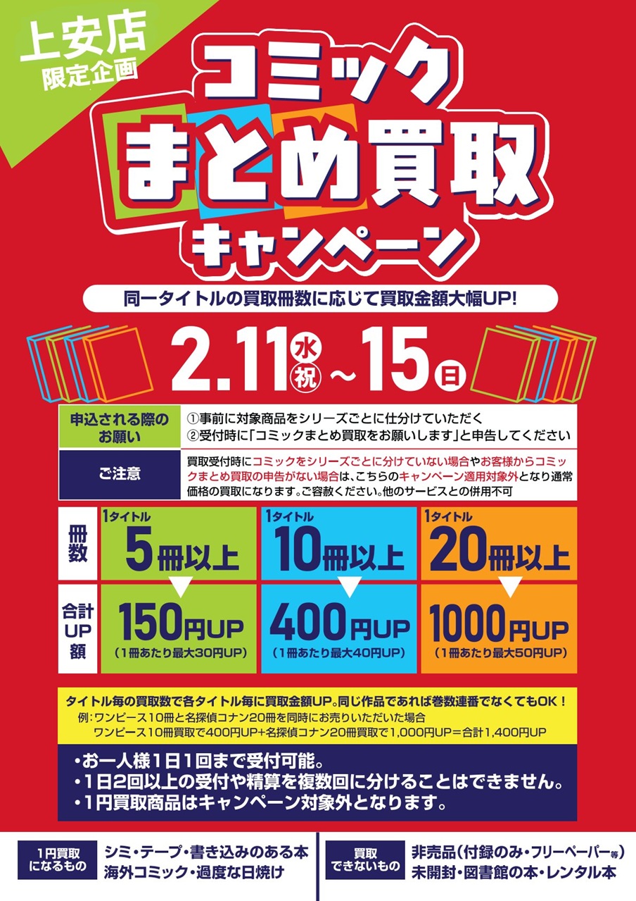 2/11(水・祝)から2/15(日)の5日間、 上安店限定で、本のまとめ買取キャンペーンを実施します。 同一タイトルコミックのお持ち込み数に応じて買取金額が大幅アップするチャンス! ※キャンペーン詳細については画像にてご確認ください。 是非この機会に読み終わった本をお売りください 実施店舗 ・上安店