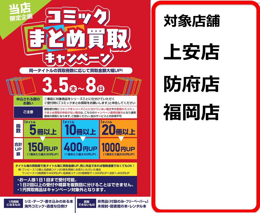 3/5(木)から3/8(日)の4日間、同一タイトルコミックのお持ち込み数に応じて買取金額アップ お得な機会にぜひお持ち込み下さいませ~ ※キャンペーン詳細・実施店舗については画像にてご確認ください。 実施店舗 ・GIGA上安店 ・GIGA防府店 ・TERAイオンモール福岡店