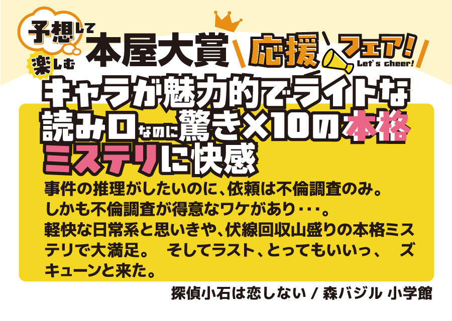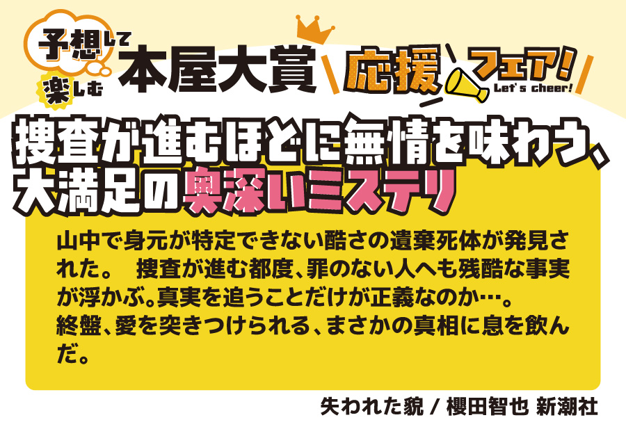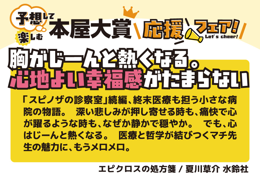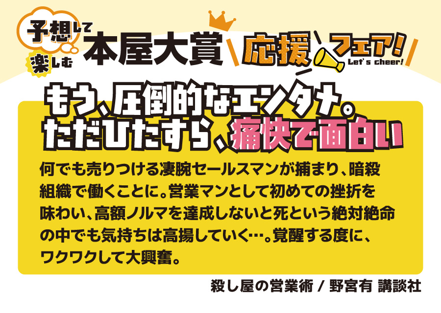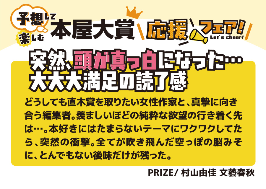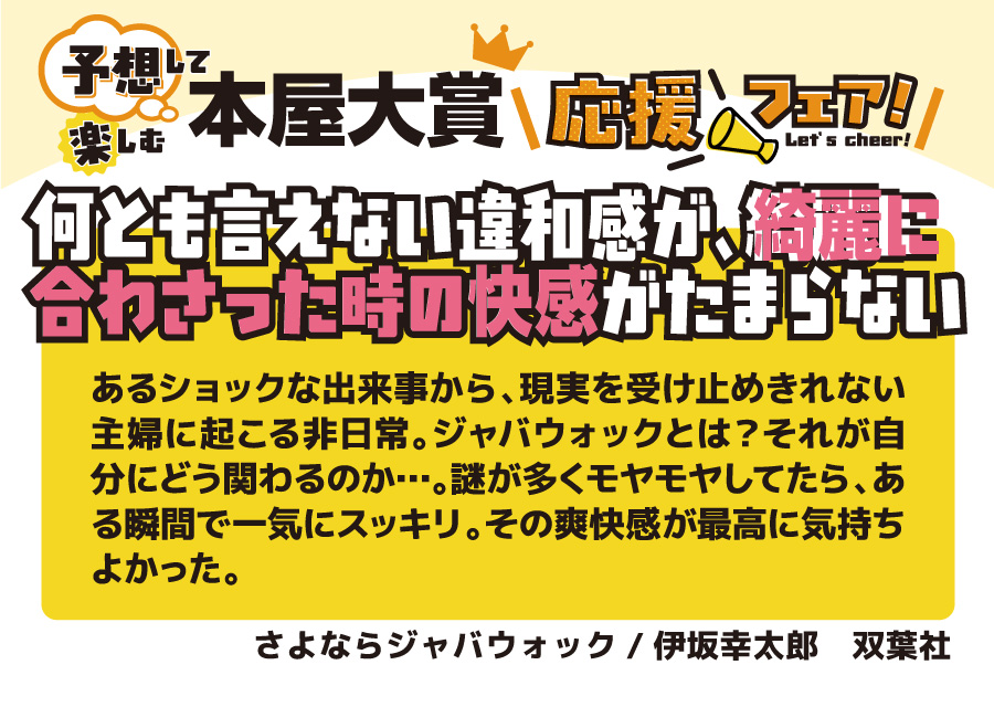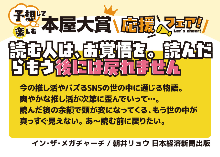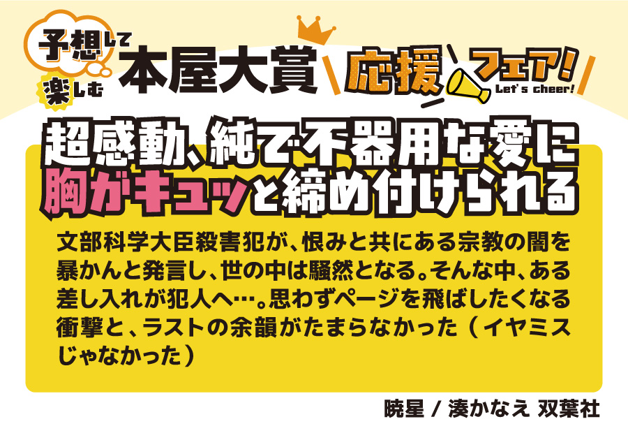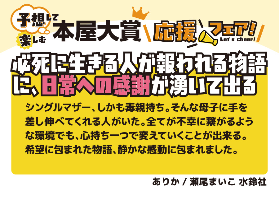 本の取り扱いのあるフタバ図書全店で開催♪ 全国の書店員が投票して、その中でも票数が多かったノミネート作品。 今年も、ジャンルも多彩で面白かったです。10作品全てを全力で推させていただきます。 ■ノミネート作品1冊お買いあげごとに1枚、文庫カバープレゼント (正和堂書店さんとのコラボ文庫カバーです) ■大賞作品を予想ください (店舗に予想ボードをご用意しておりますので投票ください) ■SNS(フタバ図書公式X)でもあなたの予想を大募集 (抽選で景品もご用意しております) ノミネート10作品は以下の通りです。 4/9の大賞発表の前に、あなた好みの一冊を手に取ってみてはいかがでしょうか。