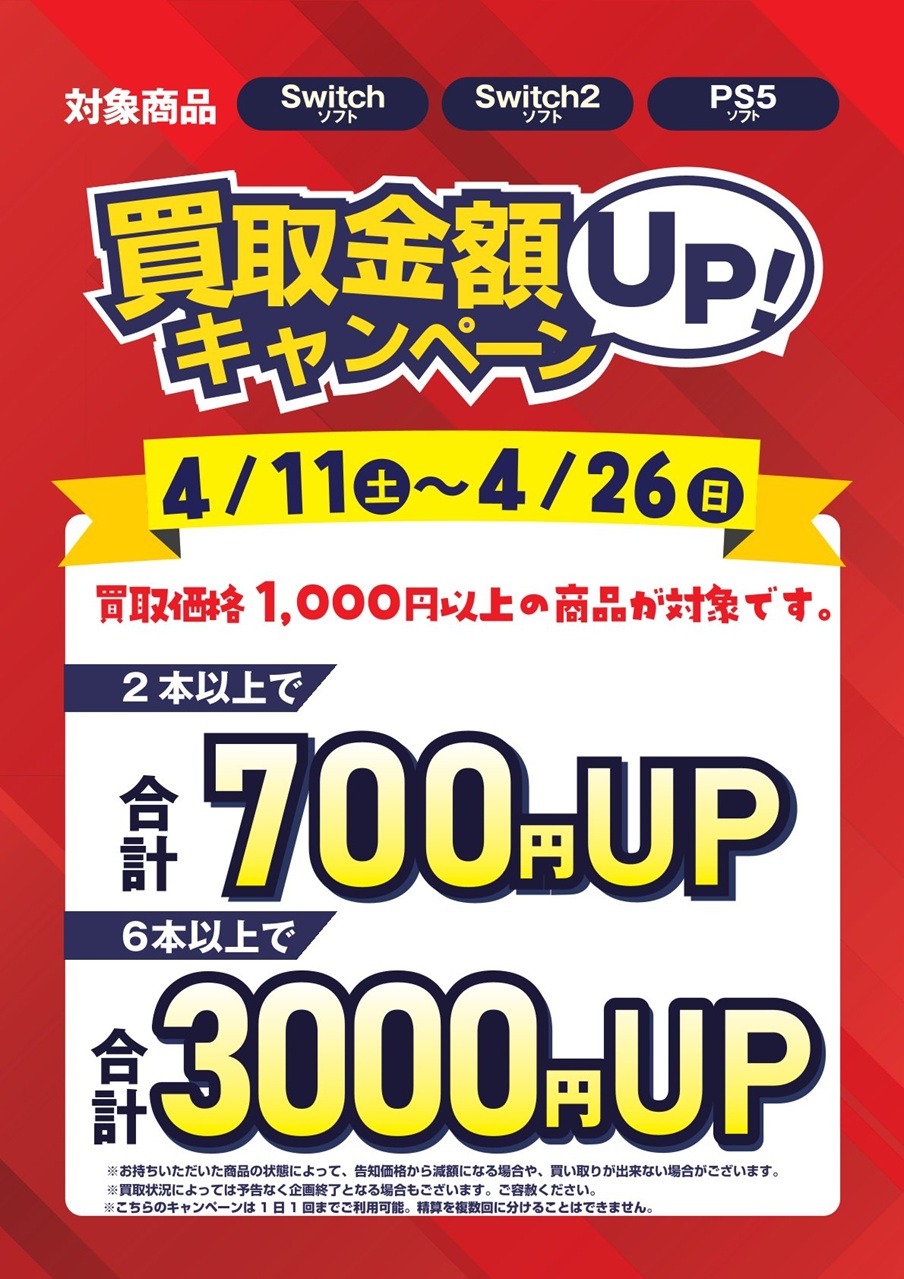 4/11(土)から4/26(日)まで、ゲーム取り扱いのある全店で開催中 対象のゲームソフトをまとめてお売りいただくと買取金額UP! (Switch・Switch2・PS5で買取価格1000円以上の商品が対象です) ■2本以上で 700円UP! ■6本以上で3,000円UP!! 詳細は画像をご覧ください。 ぜひ、この機会にお持ち込みくださいませ!