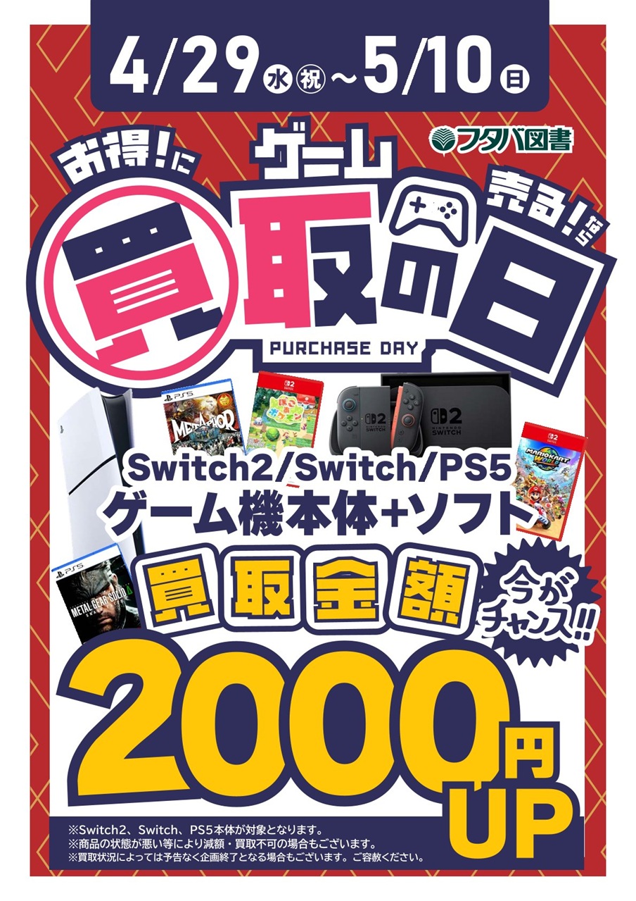 4/29(水・祝)~5/10(日)でゲーム買取キャンペーン開催 switch2・switch・PS5の本体とゲームソフトを一緒にお持ちいただくと 買取価格が2,000円UP ぜひ、この機会をご利用ください