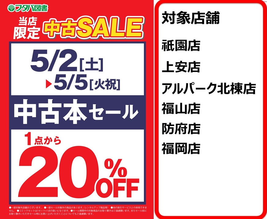 5/2-5/5【6店舗】中古本20%OFFセール開催
